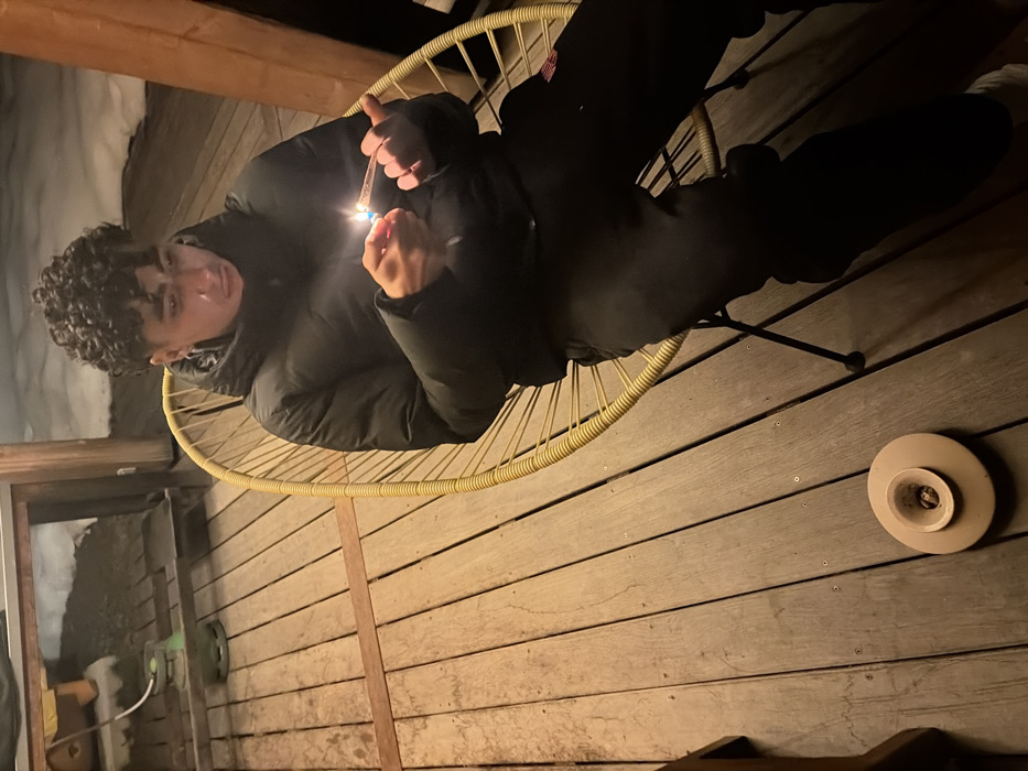 An outdoor, evening scene depicts a male subject seated on a yellow wire chair on a wooden deck in La Clusaz, France. The individual, appearing to be a young adult with curly dark hair, wears a black puffer jacket and dark pants. He is actively using a silver-colored cylindrical lighter to ignite a thin, rolled item held between his left thumb and index finger. The flame from the lighter is prominent and illuminates his hands and face. To the left and slightly in front of the chair, a beige, circular ceramic ashtray with a central depression rests on the wooden deck. In the background, beyond the deck's railing, snow is visible on the ground, and a small green gas cylinder is present on a lower wooden structure. The overall lighting is dim, suggesting nighttime or late evening conditions.