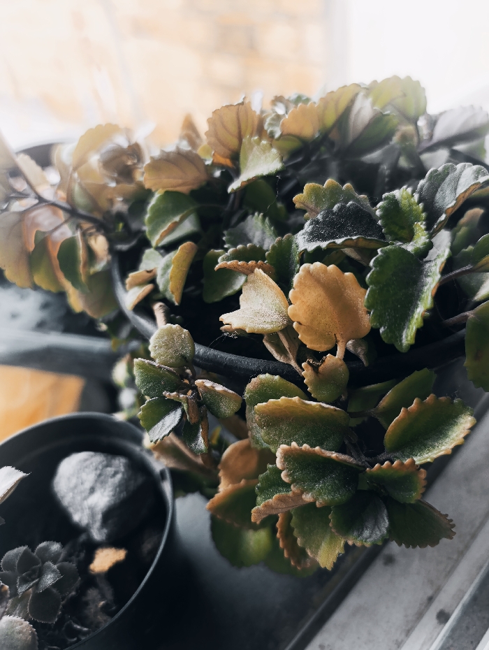 The scene is an indoor, static close-up located in Iperó, Brazil, featuring multiple potted plants positioned near a window. In the foreground and central area, a dense plant with numerous small, ovate leaves, characterized by scalloped edges, occupies the majority of the frame. The leaves exhibit a color gradient from dark green to yellow-green and light brown, with some displaying reddish undertones. Fine particulate matter is visible on various leaf surfaces. This primary plant is housed in a dark-colored pot, largely obscured. To its left, a smaller dark-colored pot contains a compact, rosette-forming succulent and a single, irregularly shaped, light-colored stone. The background consists of a brightly lit, out-of-focus area consistent with natural light entering from an exterior window. A light-colored horizontal surface, identified as a windowsill, is partially visible in the lower right section of the image. No individuals are present, and no actions or interactions are depicted.