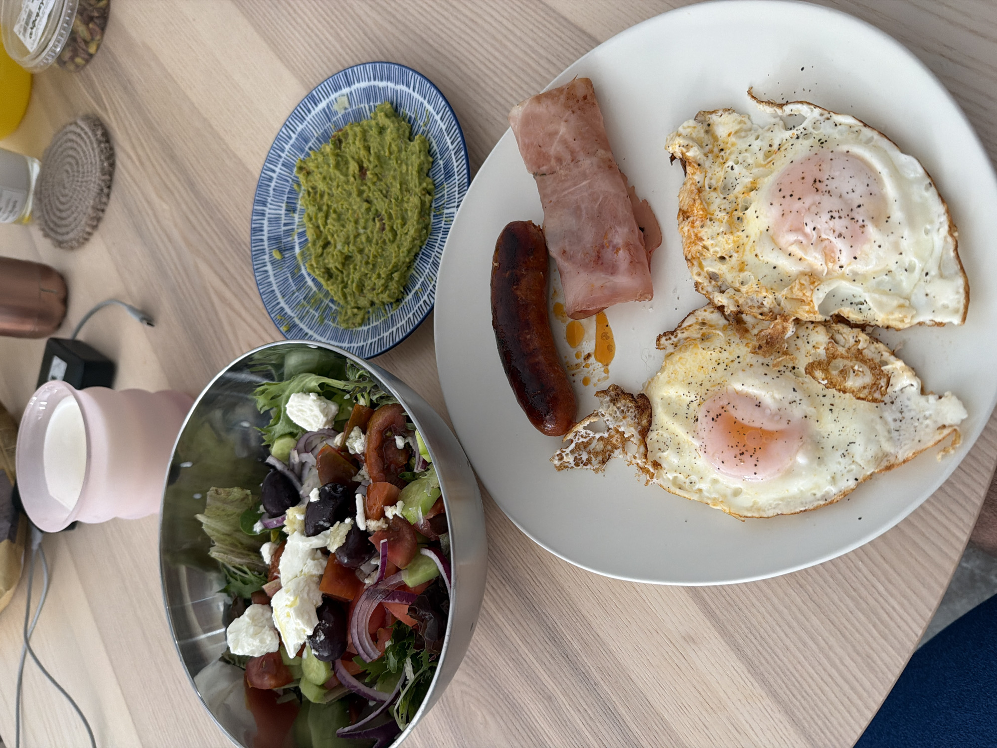 meal on a wooden table. The meal includes a salad in a metal bowl with tomatoes, cucumbers, red onions, black olives, and feta cheese. A blue and white plate contains a serving of guacamole. A white plate holds two fried eggs, a sausage, and a piece of ham. The location, Livadia Larnakas, Cyprus, is not verifiable from the image content. No people or interactions are visible.