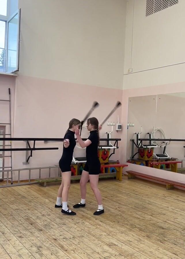 Two young women in black leotards are practicing baton twirling in a gymnasium. They stand close together, facing the camera, and perform synchronized movements with their batons. The gymnasium is well-lit with a wooden floor, a large window, a mirror, and various gymnastics equipment. One of the women steps forward briefly, twirling her baton, before returning to her synchronized routine.