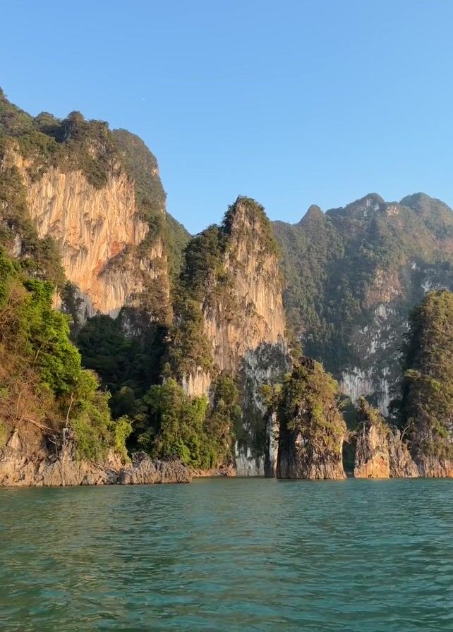 body of water with tall, rocky, tree-covered cliffs in the background. The water is calm, with ripples. The sky is clear blue. A boat is traveling on the water.