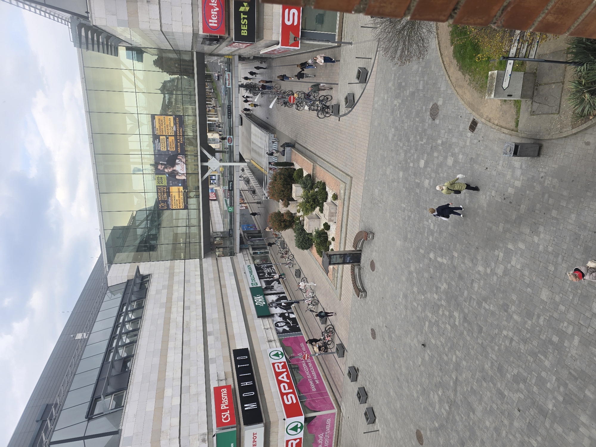 An elevated, wide-angle daytime photograph depicts an urban commercial and pedestrian area in Nyíregyháza, Hungary, specifically the plaza adjacent to the Korzó Shopping Center and the Móricz Zsigmond Theater, with Dózsa György út visible beneath a skywalk. The sky is overcast. The background features a multi-story modern building with light-colored stone cladding and extensive dark-tinted glass windows. Its ground level houses retail establishments including CSL Plasma, MOHITO, SPAR, DAK, and DEICHMANN. A prominent glass pedestrian skywalk connects two building sections over Dózsa György út. Behind the skywalk, a large digital billboard on a glass facade displays theatrical advertisements in Hungarian. The foreground and mid-ground consist of a gray paver-tiled pedestrian plaza. This area incorporates several square planters with small trees and shrubs, along with a larger central landscaped island containing similar plantings and white gravel. A curved public bench with brown wooden seating and an integrated information kiosk is situated on the right side of the plaza. Multiple bicycles are parked along the pedestrian pathways, some secured to bollards. Manholes and drainage grates are visible in the paving. A narrow strip of ground with bare trees and shrubs runs along the right edge, adjacent to a partial brick wall. A grey trash receptacle and a white directional signpost, indicating "NYÍREGYHÁZA" among other locations, are positioned on the right. Approximately 20-30 individuals, dressed in casual attire suitable for cool weather, are observed walking across the plaza and along the pathways. Two pedestrians are in the immediate foreground walking away from the viewer, one in a dark jacket carrying a white bag, and another in a light green jacket carrying a white object. A third individual in a red hat and light jacket is visible in the bottom center. Pedestrian and light vehicular traffic, including a white concrete ramp, are visible on Dózsa György út beneath the glass skywalk. Storefronts for Hervis and BEST are visible on the right side of the street level.