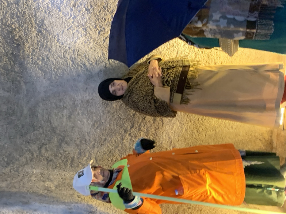Two mannequins stand against a textured wall, one in a bright orange raincoat and white construction helmet with gloves holding a pole. The other wears a dark head covering, a patterned shawl, and a tan dress under a dark blue umbrella. The lighting appears to be artificial, highlighting the wall's texture.