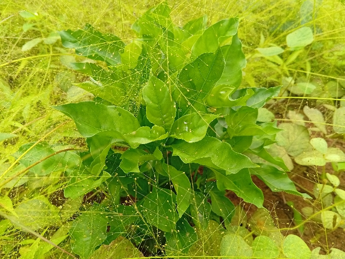 This image captures a detailed view of natural vegetation in Ejule, Nigeria. A central plant with multiple clusters of broad, ovate, dark green leaves, some exhibiting minor surface irregularities, is prominent. This plant is surrounded by and intermingled with lighter green, wispy grass featuring numerous small, delicate seed heads. Towards the periphery, particularly on the right and bottom, broader, paler green leaves of a different ground cover plant are visible. Patches of reddish-brown soil are discernible beneath the dense foliage. The scene is illuminated by natural light. No individuals, animals, man-made objects, or specific actions are depicted.