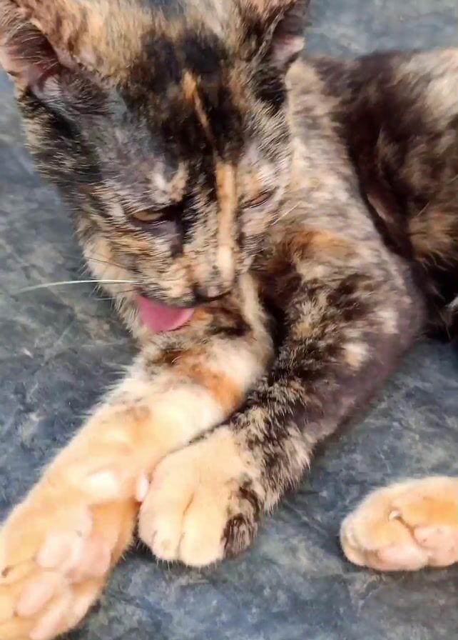 A close-up shot shows a calico cat lying on what appears to be a dark gray surface. The cat is actively grooming itself, using its tongue to lick its paw. The cat's fur is a mix of black, orange, and tan colors. Its eyes are open, revealing a yellow hue.