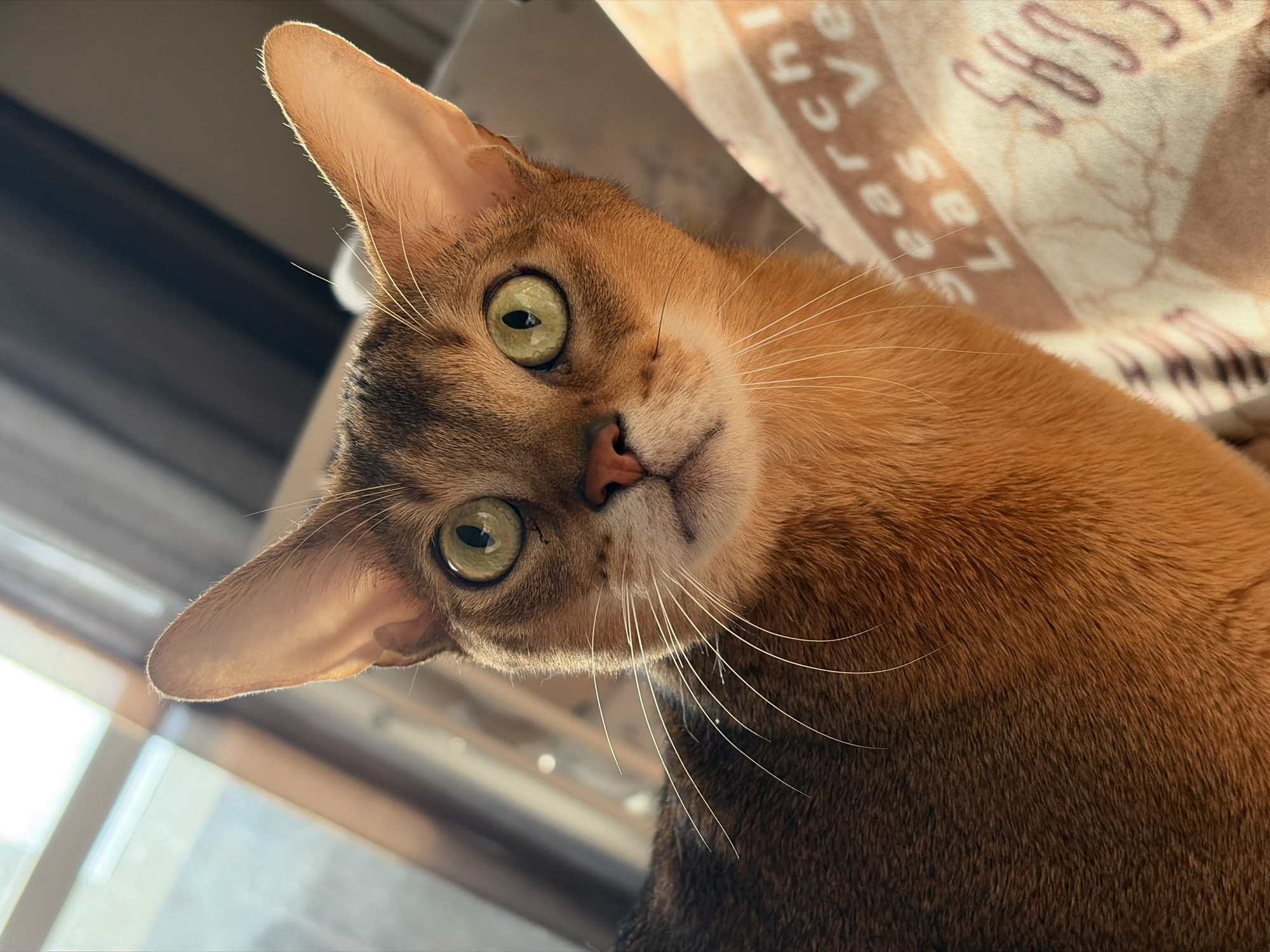 The image presents a close-up, frontal view of an Abyssinian cat, positioned indoors in what is identified as Chaikovsky, Russia. The cat exhibits short, reddish-brown ticked fur, a pink nose, prominent pointed ears, and large, round, alert green eyes with vertically elongated pupils, fixed in a direct gaze toward the viewer. White whiskers are clearly visible extending from its muzzle. Strong backlighting or side lighting from the upper left illuminates the cat's right ear and the golden-orange hues of its fur. The immediate background to the left is a blurred, bright area, consistent with a window or significant light source. To the right, a textured, light-colored textile, likely a blanket or pillow, features partial dark lettering, with discernible words "Search" and "Las Ve" visible. No human subjects are present in the frame.