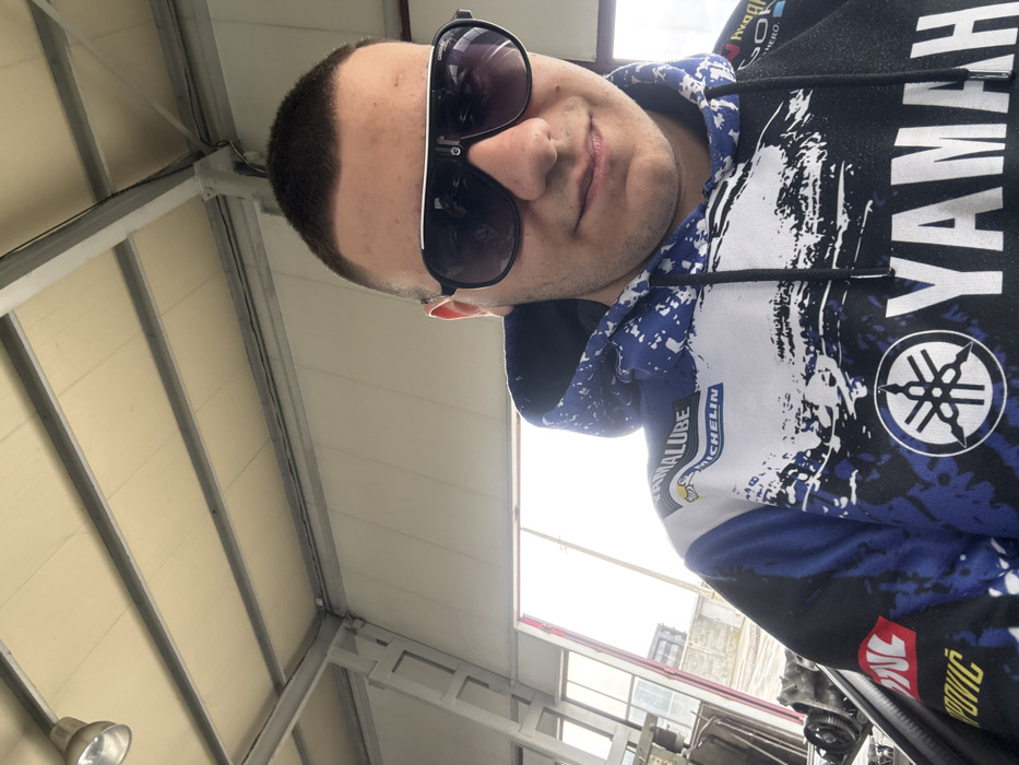 close-up selfie of a young adult male, indoors. He has short, dark, buzz-cut hair and wears dark aviator-style sunglasses with "Carrera" visible on the right frame. A small red mark is present on his forehead above his right eyebrow. He is wearing a hooded sweatshirt with a blue, white, and black splatter or distressed pattern, prominently featuring a white "YAMAHA" logo and tuning fork emblem. Other visible sponsor logos include "YAMALUBE," "MICHELIN," "AKRAPOVIC," and "GoPro." He looks directly at the camera with a slight smirk. The background suggests an industrial or workshop environment. The ceiling consists of light-colored panels supported by grey metal beams. An exposed incandescent light fixture hangs from the ceiling in the upper left. The walls are light-colored and paneled. To the left, a large, bright rectangular opening, likely a doorway or window, reveals a brightly lit exterior with vague details of a grey structure and machinery parts. Grey metal structural elements are also visible in the left midground. The scene is located in the city of Trud, Bulgaria.