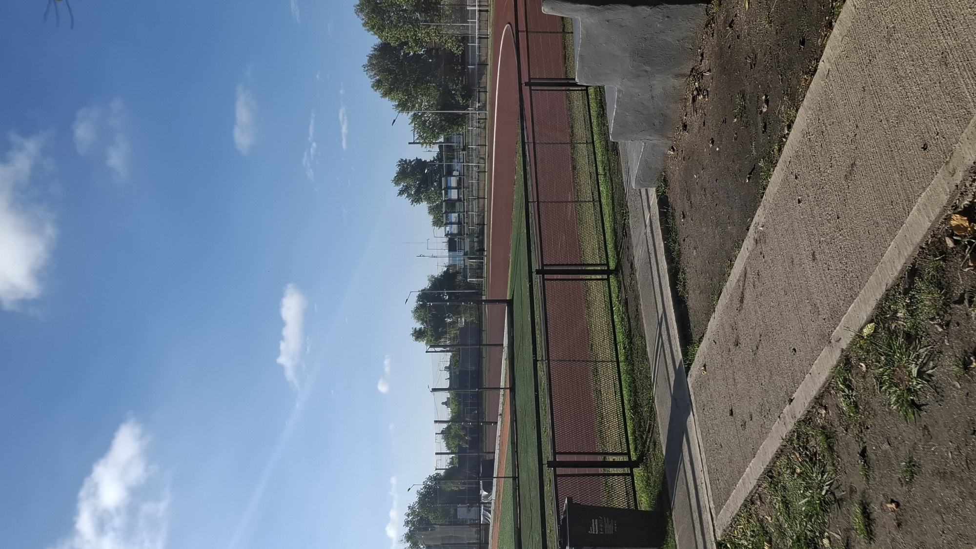 The image depicts a track and field area in Villa Domínico, Argentina, under a clear blue sky with scattered white clouds. A red running track is visible, bordered by a green artificial turf field. A black metal fence runs along the edge of the field, separating it from a concrete walkway. Beyond the fence and track, there are trees and stadium seating. The concrete walkway has grass and dirt alongside. A trash receptacle is partially visible near the fence.