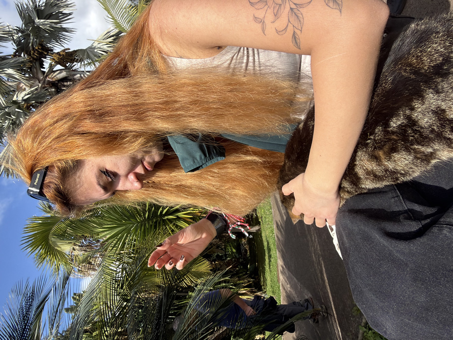 - "A young woman with long, reddish-blonde hair and a nose piercing is depicted sitting outdoors under a clear blue sky, surrounded by abundant palm trees and lush green foliage, consistent with a botanical garden setting in Funchal, Portugal" by FM-R7RZz2, licensed under CC BY 4.0