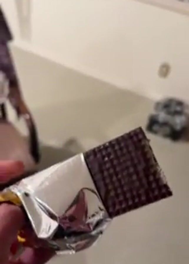 A hand holds up a partially unwrapped dark chocolate wafer bar. The wrapper is crinkled silver foil. The wafer has a distinctive grid pattern. In the background, a living room is visible with off-white walls, a chair, and a small black toy car. The camera is handheld and slightly shaky. The focus is on the wafer bar.