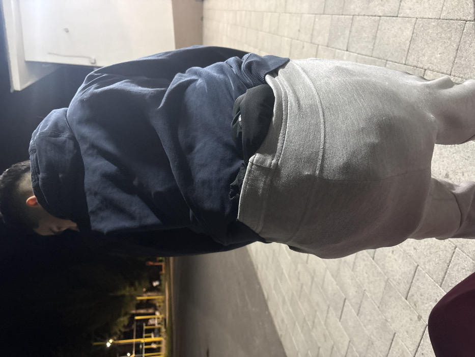 An individual is depicted from behind and slightly to the right, standing outdoors at night on a paved surface in Botevgrad, Bulgaria. The subject wears a dark navy blue hooded sweatshirt and light grey sweatpants. A black object or garment is tucked into the waistband of the sweatpants, creating a visible bulge at the lower back beneath the hooded sweatshirt. The individual's head is turned to the left, facing away from the camera. The ground is composed of light grey rectangular paving stones. In the lower-left foreground, a portion of a reddish-brown object is visible. The background on the left features a dimly lit area with trees or bushes, illuminated by several yellow-hued streetlights or park lights, casting light upon a dark paved surface and faint outlines of structures. To the right, a light-colored building or wall is visible, brightly illuminated by an unseen light source.