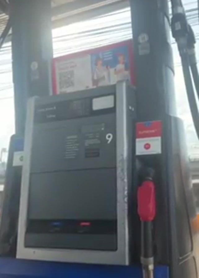 gas pump at a Mobil station. The pump is blue and gray, and it has a red nozzle. The digital display shows the amount of gas being pumped and the price. The video appears to be taken during the daytime.