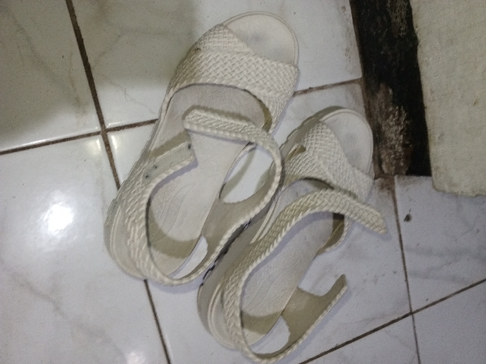 - "Two white sandals with woven straps and buckle closures sit on a tiled floor" by FM-Z0D4I2, licensed under CC BY 4.0