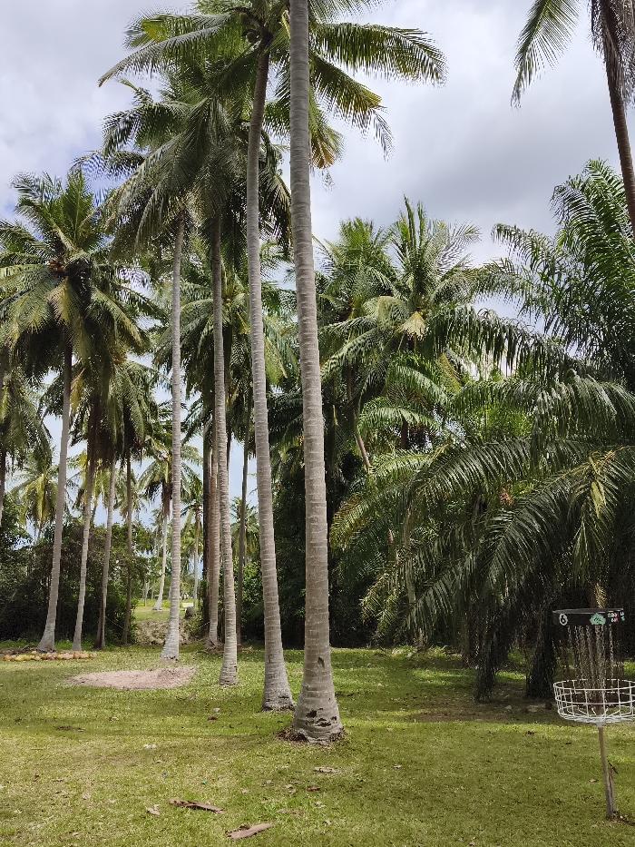 A vibrant scene showcases a disc golf basket in a lush, tropical setting. Tall coconut palm trees dominate the landscape, their slender trunks reaching upwards with green fronds. Dense foliage and other palm varieties fill the background. Short grass covers the ground. The sky is partly cloudy. A disc golf course is implied by the presence of the basket.