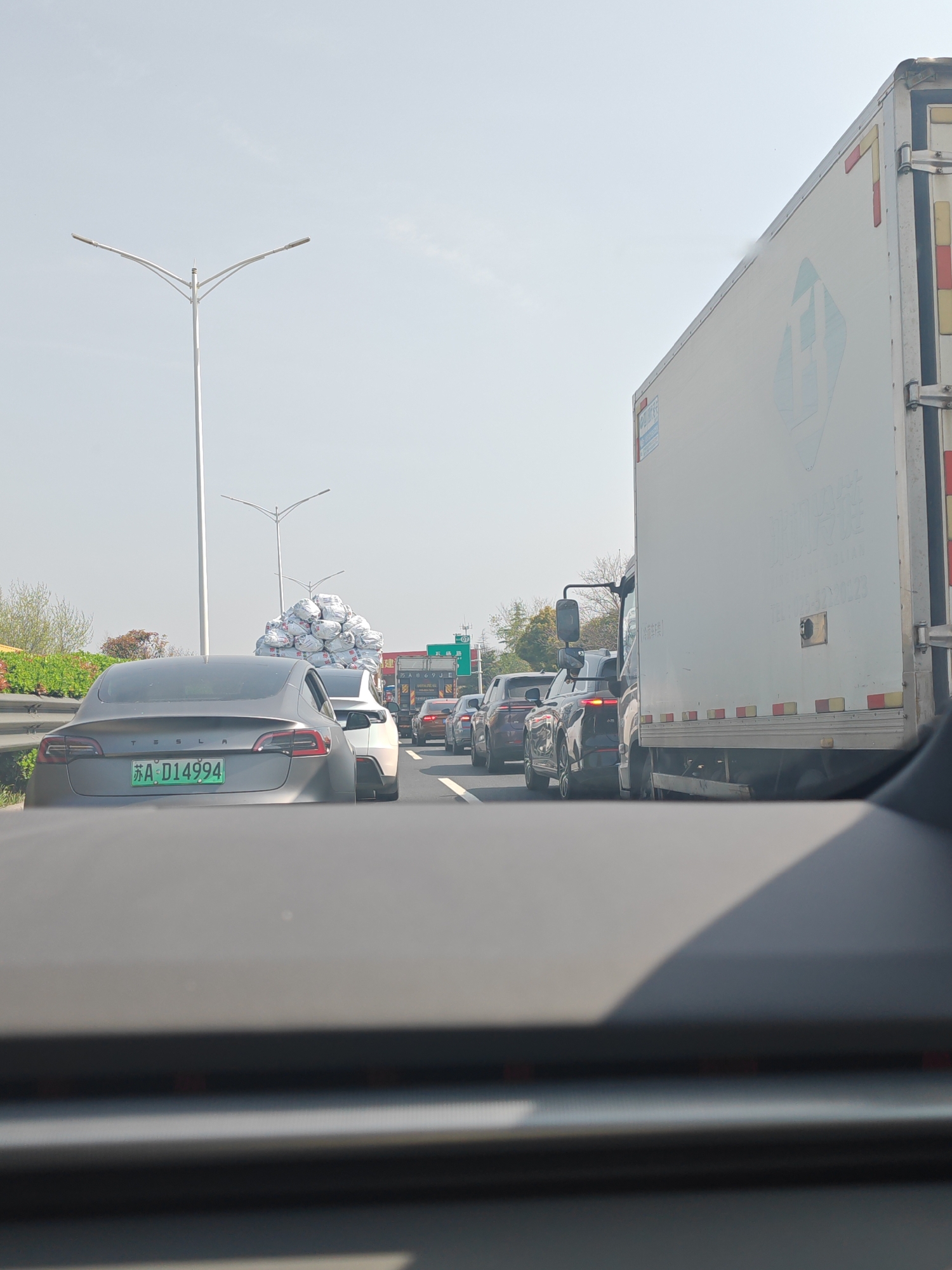 The image depicts a daytime scene of vehicular traffic on a multi-lane highway within Qinhuai District, Nanjing, Jiangsu Province, China. The perspective is from inside a vehicle, with the upper portion of a dark dashboard visible in the foreground. In the immediate foreground, a gray Tesla Model 3 sedan is directly ahead, displaying a green Chinese license plate with characters "苏A D14994," indicating its registration in Nanjing. Behind the Tesla, a white sedan is visible, heavily loaded with numerous large, white, bulging sacks piled high on its roof. To the right of the Tesla, in an adjacent lane, a black SUV is partially visible, followed by additional vehicles further down the road. On the far right of the frame, a large white box truck occupies a significant portion of the lane, featuring a blue stylized logo and Chinese text on its side, along with red and yellow reflective safety markings on its rear. The road is asphalt, with a metal guardrail separating the left lane from a roadside area featuring green foliage and bare trees. Multiple tall, white streetlights with dual-arm fixtures are spaced along the left side of the road. An overhead green road sign, partially obscured with Chinese characters, is visible in the distance. The sky is clear and light blue, indicating fair weather. All vehicles appear to be stationary or moving slowly in a traffic queue. No individuals are explicitly visible.