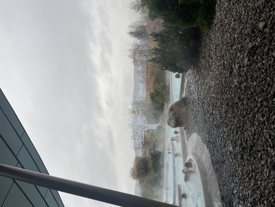 The scene depicts an outdoor thermal bath complex located in Ribeauvillé, France, under an overcast sky. In the foreground, a dark grey diagonal support pillar for a building overhang is visible on the upper left, while the lower portion of the frame is dominated by dark grey crushed stone or gravel. The midground features multiple interconnected, irregularly shaped thermal pools with light blue water emitting significant steam, indicative of warmth. Approximately 15 to 20 individuals, both male and female, are visible within these pools, mostly submerged from the chest up, engaged in relaxation or casual interaction. The pools are bordered by light grey stonecoping. Several large, dark grey boulders are positioned at the edges of the pools and within the gravel landscaping. Further into the midground and background, there is varied vegetation including evergreen shrubs and bare deciduous trees. A prominent, bare tree adorned with numerous white lights stands centrally, illuminated despite the daytime conditions. Beyond the immediate pool area, a brown-toned pedestrian bridge or elevated pathway is visible through the trees. The distant background features dark grey hills or mountains under a uniformly light grey, cloud-covered sky. The overall environment suggests a leisure or wellness facility during cool, overcast weather.