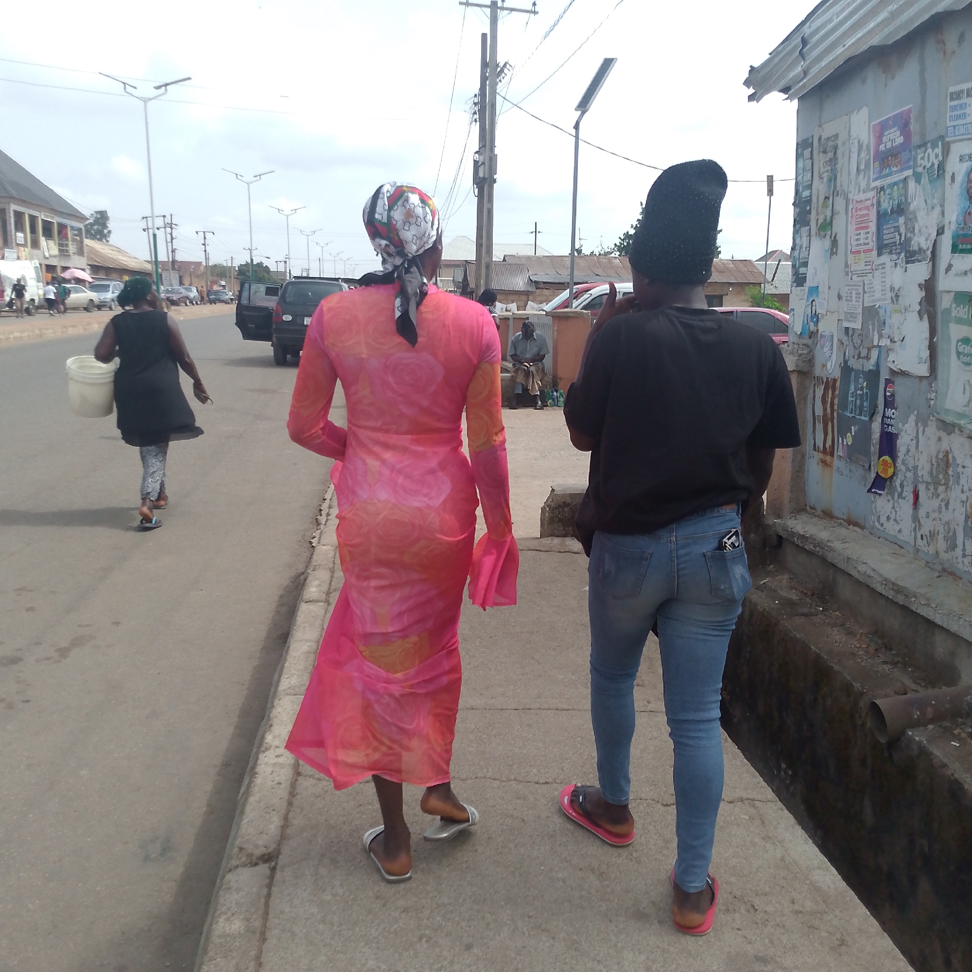 The image depicts a street scene in Bukuru, Nigeria. Two women walk away from the viewer on a sidewalk. One woman wears a pink floral dress and a headscarf, while the other wears a black shirt, blue jeans, and a dark-colored beanie. Both women wear flip-flops. A third woman carrying a white bucket walks on the road in the same direction. A black SUV is parked nearby. Across the street, a man sits on a bench. The sidewalk has a drainage ditch on its edge, next to a wall covered with posters. Utility poles and street lights are visible in the background. The sky appears overcast.