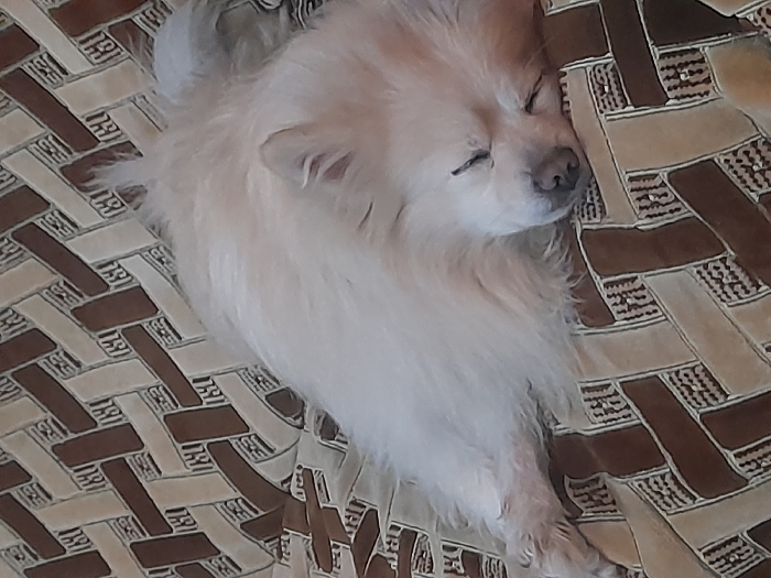 A white, long-haired canine, consistent with a Spitz-type breed, is depicted resting horizontally on a patterned textile surface. Its head is oriented toward the lower right, eyes closed, indicating a state of sleep. Dense white fur covers the visible body of the animal. The background surface exhibits a repeating geometric pattern composed of interlocking light beige and brown 'L'-shaped segments, creating a continuous diagonal design. No environmental details are visible to determine a specific geographic location, including a city such as Yerevan, Armenia.
