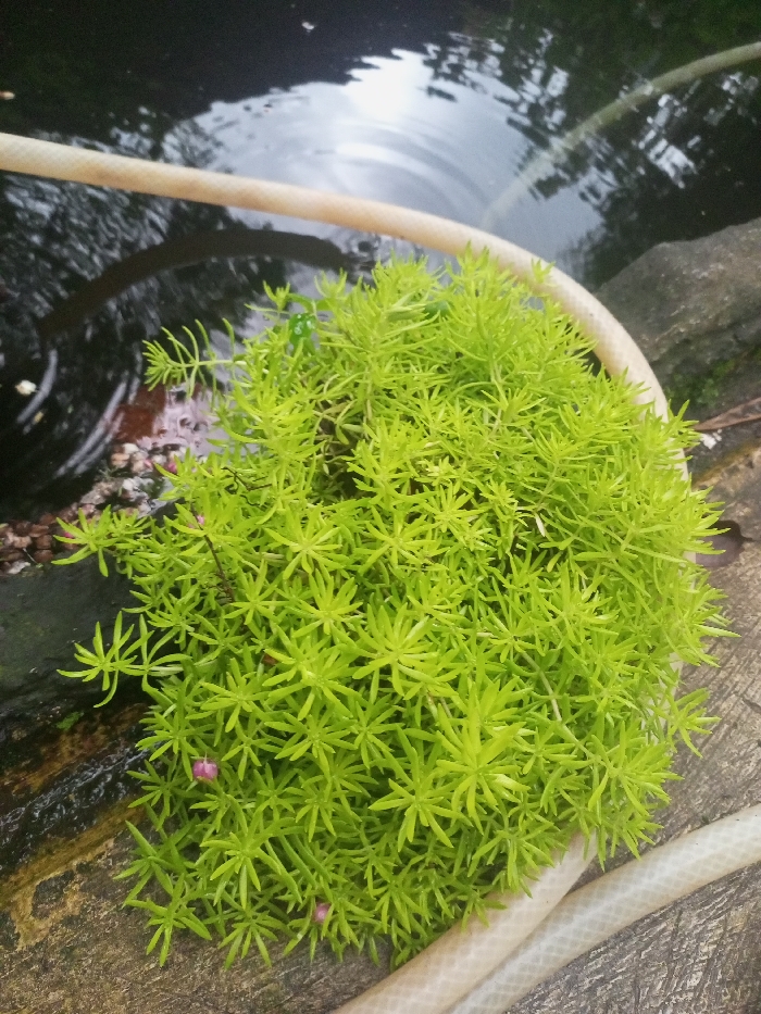 The scene, located in Bamhori, India, presents a vibrant green succulent plant in a light-colored, circular pot positioned on a rough, dark ground surface. The plant exhibits dense, bright green, needle-like foliage, among which several small, pink floral buds are visible. A light-beige, translucent garden hose diagonally traverses the frame, arching over a portion of the plant and extending towards a dark body of water visible in the upper left background. The water's surface reflects diffuse light and displays subtle ripples. The ground surface immediately surrounding the plant and bordering the water appears to be dark, textured stone or concrete. No individuals are present.
