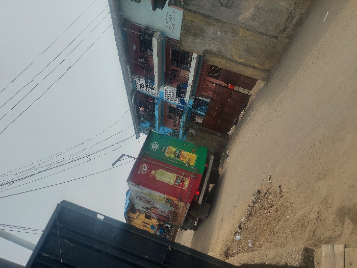 The scene depicts an unpaved or poorly maintained dirt road in the city of Agani, Nigeria, under an overcast sky. A multi-colored box truck, featuring red, yellow, and green panels with beverage advertisements, occupies the mid-ground, facing away from the viewer. Its rear is visible, with red taillights. To the right of the truck, a light blue multi-story building with brown balconies and white decorative railings stands behind a concrete wall and a closed brown metal gate. Further down the road, partially obscured by the truck, is a yellow building with a blue roof. The foreground on the left shows a dark, angular structure, possibly a gate or wall, and a mound of dirt and debris on the roadside. Numerous overhead utility wires traverse the upper portion of the frame, and a street light pole is visible between the truck and the blue building. No individuals are present.