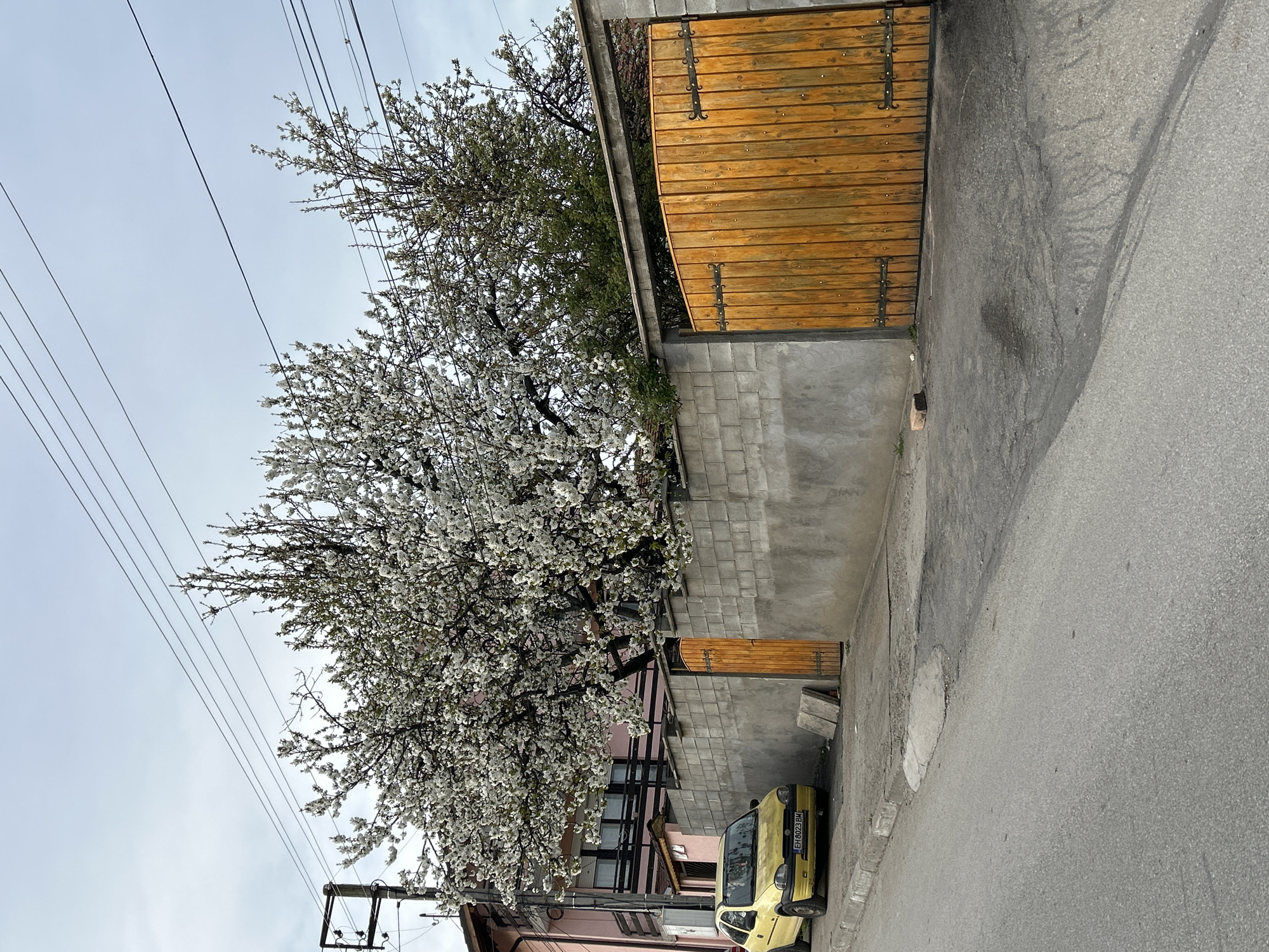 The image depicts a street scene in Bukovlak, Bulgaria. A yellow car is parked on the side of the street near a concrete block wall with wooden gate. A tree with white blossoms is in full bloom next to the wall. Overhead power lines are visible against a cloudy sky. A pink building is partially visible behind the tree.