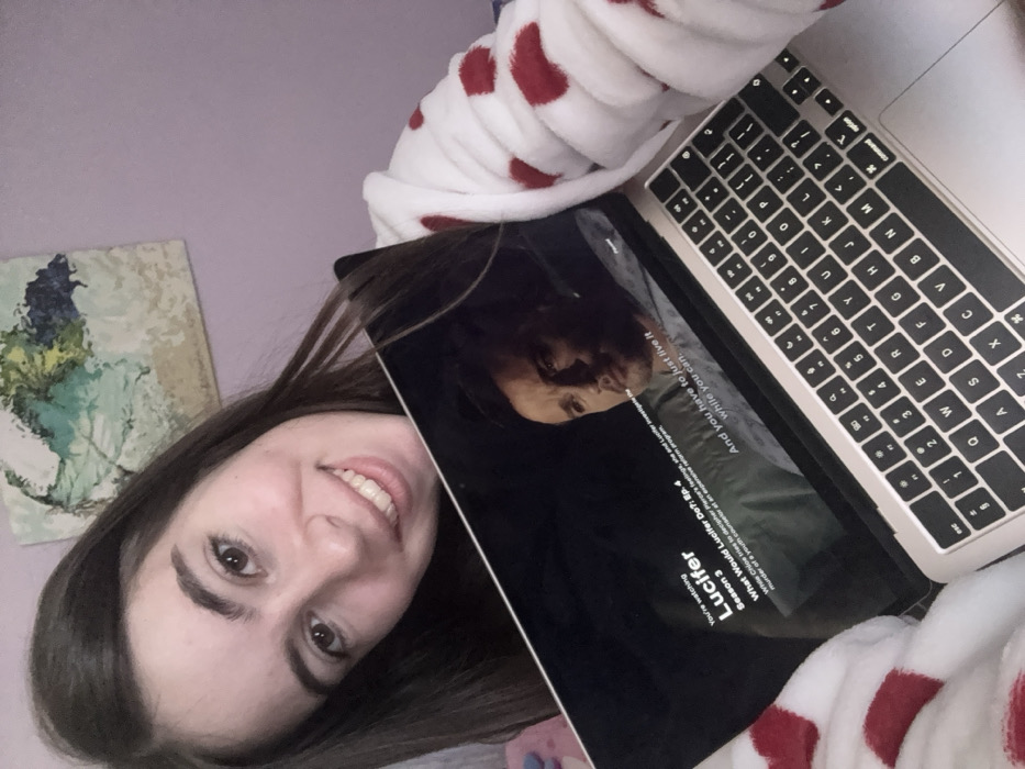 The image portrays a young female subject, appearing to be in her late teens or early twenties, with long dark hair, a light complexion, and a discernible smile, situated indoors in Varna, Bulgaria. Her upper body is angled towards the camera. She is wearing a white garment with red polka dots, visible on her right arm and shoulder. The subject holds an open silver-colored laptop computer, which occupies the central and lower portions of the frame. The laptop screen displays content from a streaming service. The interface indicates "You're watching Lucifer Season 3," specifically Episode 4, titled "What Would Lucifer Do?". A male actor is visible on the screen. Subtitles are present, displaying the text: "And you have to just live it while you can." The laptop's keyboard is visible, featuring a standard QWERTY layout. The background consists of a solid light purple wall, on which a framed abstract artwork with shades of green, blue, and white is mounted.