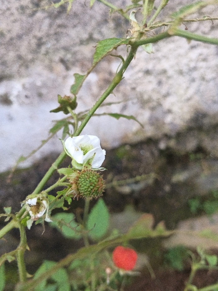 A close-up captures a flowering plant with a mix of stages. A small, white, open blossom sits above a spiky, green, unripe berry. Further down, another flower is withered and browning. A single, ripe, red berry is also visible. The plant's stem is green, and several green leaves are present, some showing signs of insect damage. A textured, mottled gray wall provides the backdrop.