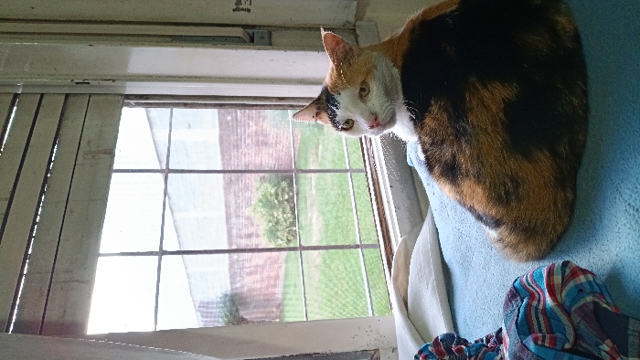 - "A calico cat, predominantly black, orange, and white, is observed seated on a light blue textured surface, likely a bed or cushion, adjacent to a window inside a residence in Bella Vista, Argentina" by FM-b9zBW2, licensed under CC BY 4.0
