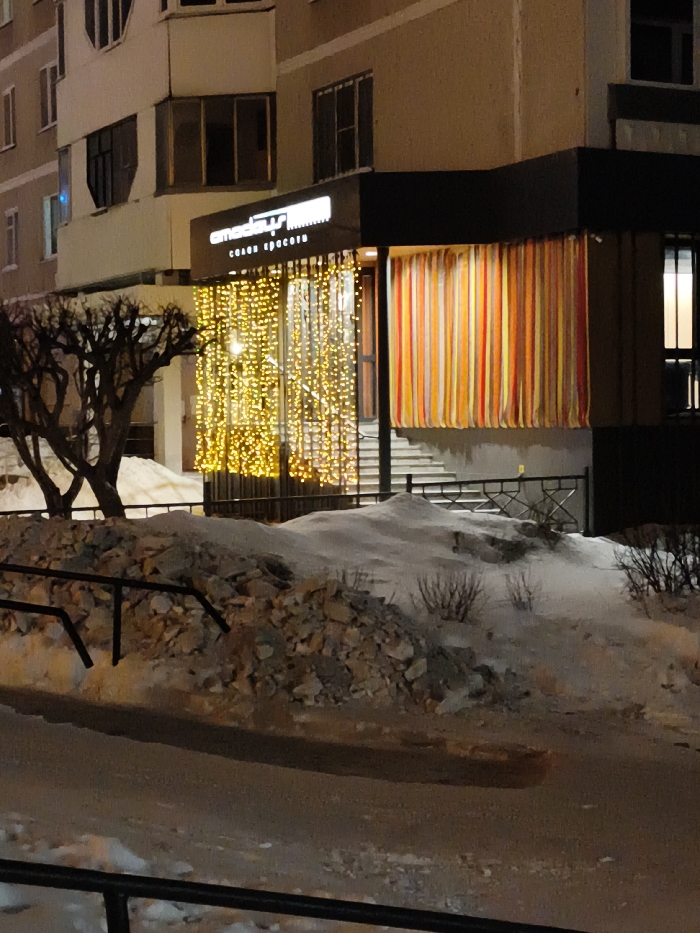 A low-angle shot reveals a building's ground-level establishment, adorned with vibrant, vertically striped curtains in yellow, orange, and red hues. Sparkling lights cascade like rain on an adjacent section. The foreground is dominated by a snowy landscape with scattered rocks and a leafless tree branch. A black metal railing frames the base of the image, while the building's upper floors rise in the background.
