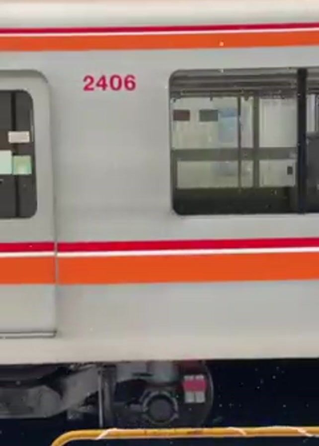 train car at a train station in a snowy environment. The train car is primarily light gray with an orange and red stripe running horizontally along the side. The train car's door opens and then closes. The number 2406 is printed on the side of the train car. Some snow is accumulating on the ground. An audible announcement is made, though the specific words are not clear.