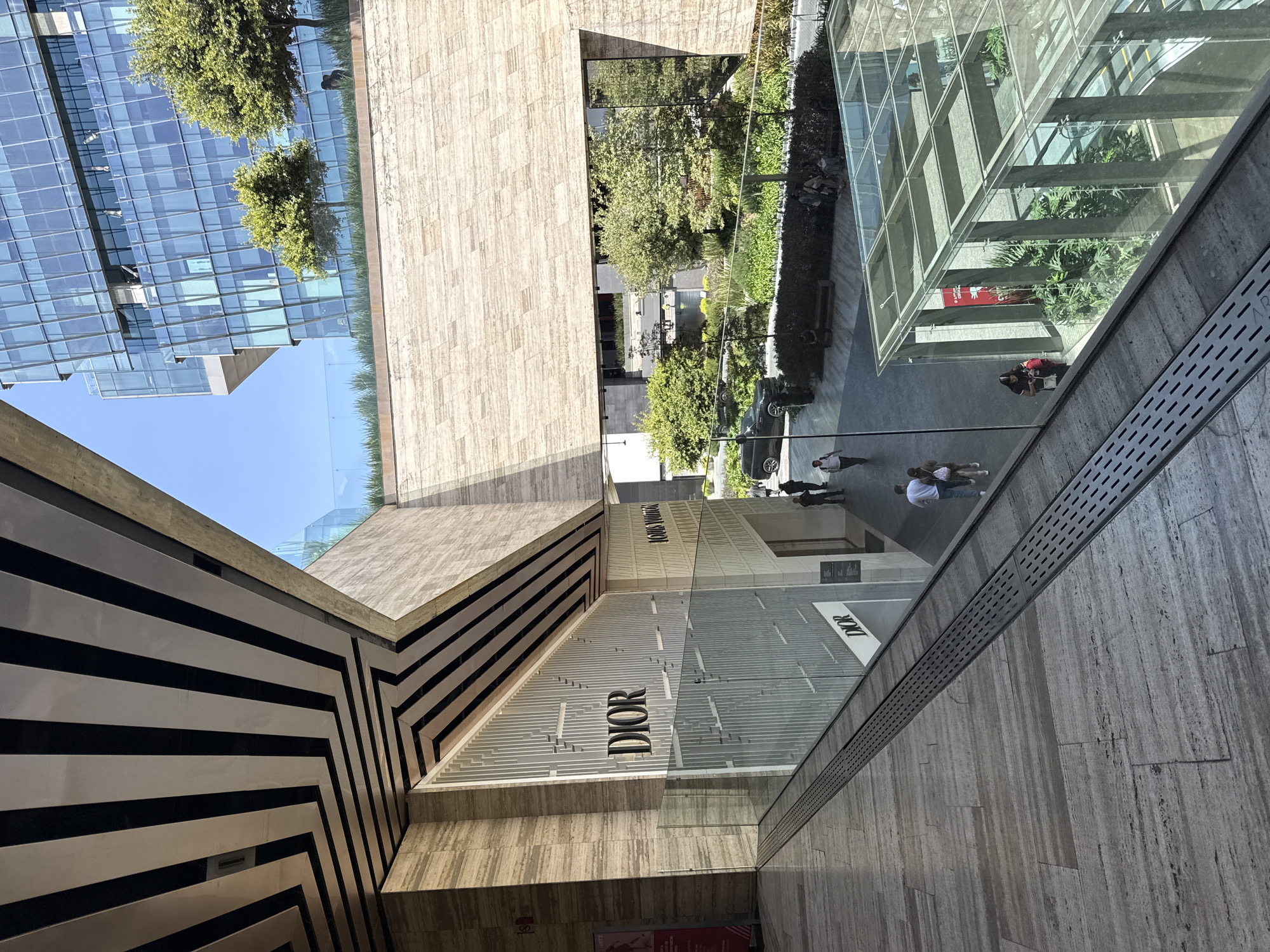 An eye-level shot is taken in Mexico City, Mexico, in an outdoor upscale shopping area, with Dior and Louis Vuitton stores visible. The view is from a slightly elevated position looking down at the scene. People are walking on the sidewalk, and trees and plants are present. The architecture features modern glass and stone buildings, including a building with black and white striped patterns on one wall.