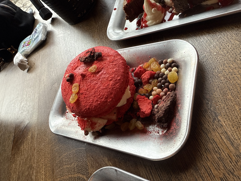 A tabletop scene within the Salted Cafe in Sofia, Bulgaria, features two metal trays of desserts on a distressed light brown wooden surface. In the foreground and center, a rectangular silver-colored metal tray holds a large, round, vibrant red dessert, resembling a giant macaron, filled with white cream. The red shell is coated with a fine red powder. The top of the dessert is adorned with three yellow raisins and several small, dark, spherical embellishments. Scattered around the base of the main dessert on the tray are various toppings, including irregular chunks of red-dyed confection, several pieces of dark chocolate crumble, additional yellow raisins, and a cluster of multi-colored chocolate pearls (white, light brown, and dark brown). A reddish powder is lightly dusted on the tray surface. To the right, a second identical silver-colored metal tray is partially visible, presenting a dark-colored dessert with dollops of white cream and streaks of red sauce. The background reveals a dark brown wooden table with visible grain and, in the upper right, a blurred dark object resembling a handbag and a crumpled white paper napkin or tissue.