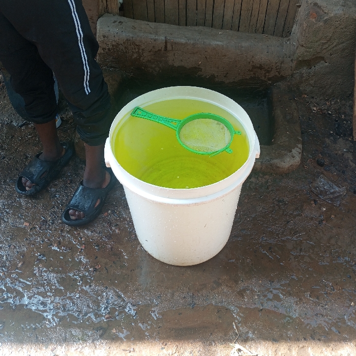 A white bucket full of yellow liquid sits on a damp, muddy surface. A green plastic strainer rests inside the bucket. To the left, a person wearing dark pants with a white stripe down the side and black sandals stands next to the bucket. A concrete structure is visible in the background, possibly a drainage or sanitation fixture. The surrounding area appears wet and dirty.