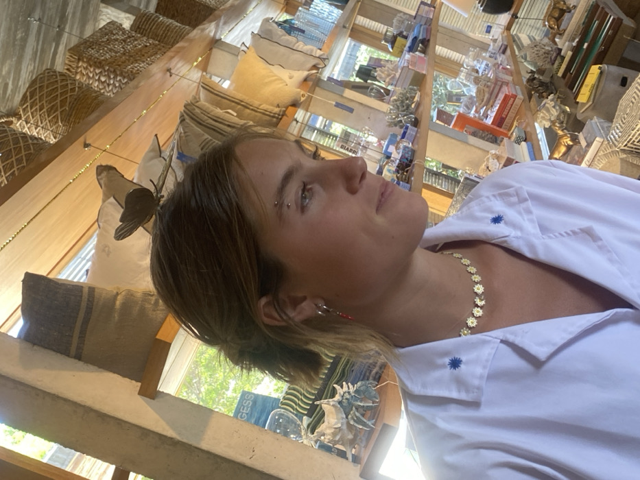 A woman with an eyebrow piercing and short hair looks up and to the right, wearing a white collared shirt with small blue flowers on the collar and a daisy chain necklace