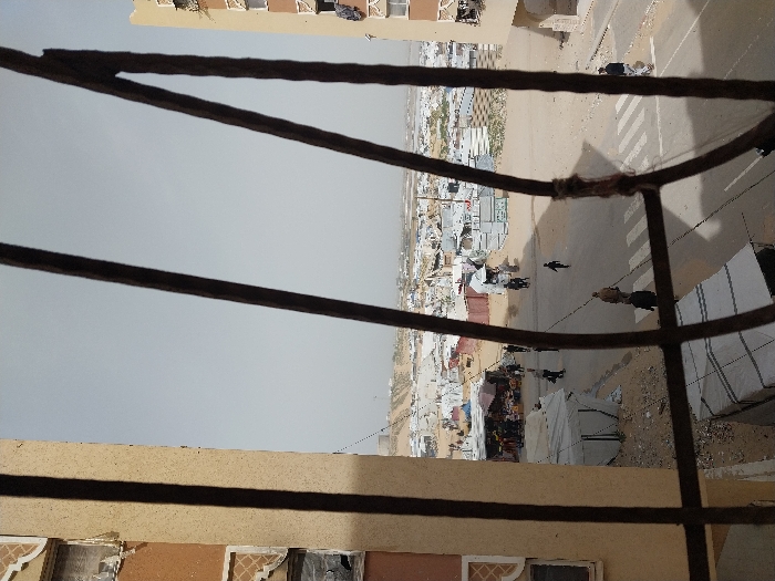 An elevated, downward-looking view through rusty metal bars frames a scene in Khan Yunis, Palestinian Territory