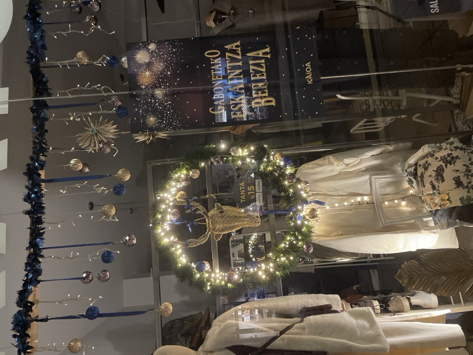 A shop window displays festive decorations. A wreath adorned with lights and a straw reindeer head hangs centrally. Christmas ornaments and blue tinsel adorn the left side. A promotional sign with the text "Gabonetako Eskaintza Berezia KAIOA" is visible above the wreath. Mannequins dressed in light-colored clothing are showcased within the window. A second sign featuring "TANTA %15 KAIOA" is displayed on the wreath.