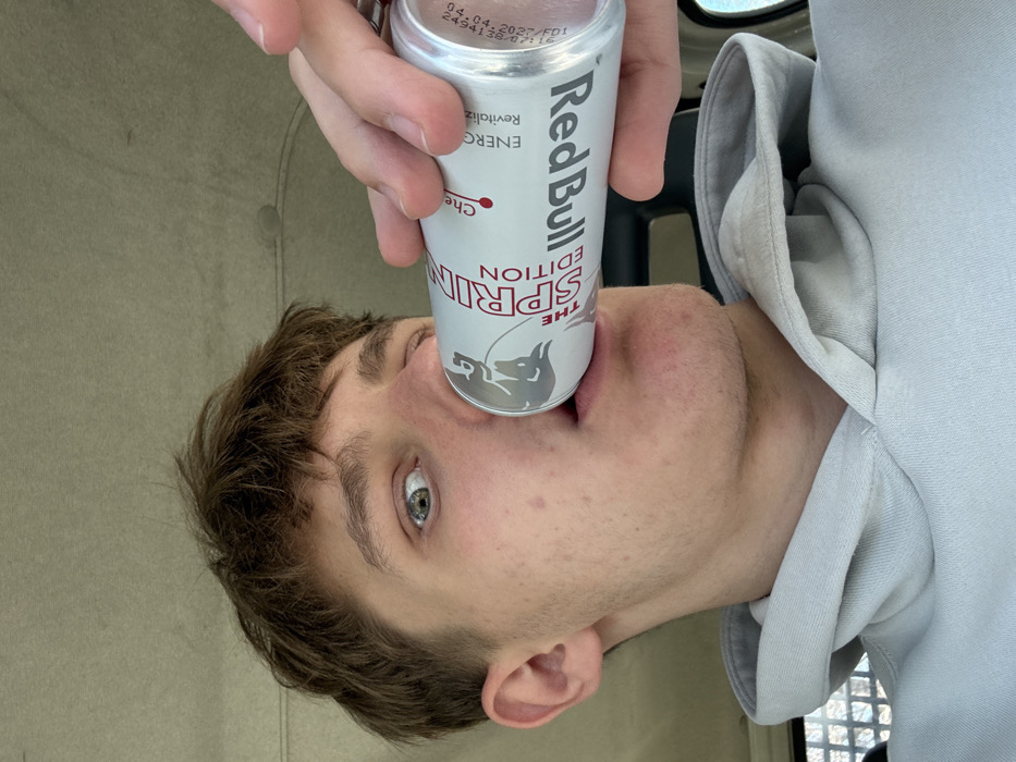 A close-up photograph depicts a young male, appearing to be in his late teens or early twenties, situated within what is identifiable as the interior of a vehicle. The male has short, brown hair and light skin. His right eye (viewer's left) is wide open and directed towards the camera, while his left eye is partially obscured by a beverage can. He is wearing a light grey hooded sweatshirt. The male is actively drinking from a silver Red Bull "The Spring Edition" energy drink can, which is held to his mouth with his right hand. The can displays "Cherry" flavor and "ENERGY DRINK" text. A date, "04.01.2024," and a timestamp, "09:34:13," are faintly visible on the can's side. A ring is present on the ring finger of his right hand. The background consists of a light-colored fabric headliner of the vehicle and a faint, dark grid pattern visible through a rear window or internal partition. No specific visual information in the image allows for the determination of a precise location within the city of Plovdiv, Bulgaria.