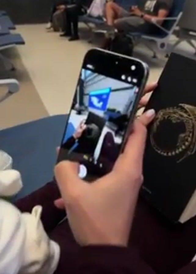 A person is sitting in an airport waiting area, wearing a maroon-colored top and trousers. They are holding a black passport with an ornate gold design and a smartphone, which is displaying the camera app in photo mode. The camera is focused on the person's hand holding the passport. Next to the person on the seat is a small white object. In the background, there are other people sitting on blue chairs, along with a wall featuring a green graphic display. The waiting area is brightly lit.