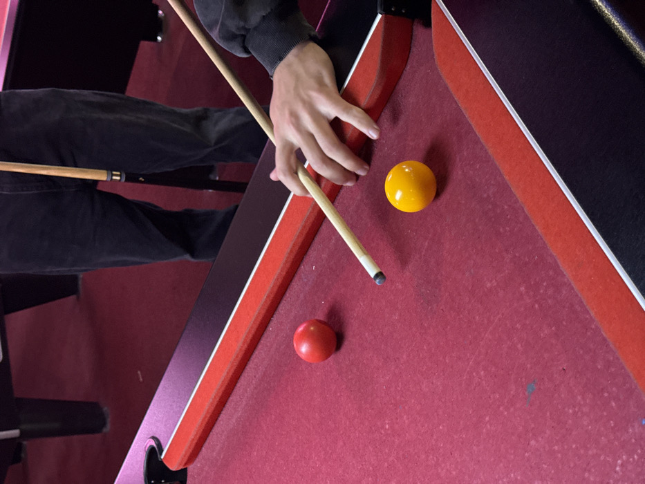 In an indoor recreational facility in Reichstett, France, a close-up, eye-level shot captures a segment of a pool table and two individuals. The primary focus is on a red-felted pool table, showing wear consistent with use. Two solid-colored billiard balls are present: a red ball positioned towards the upper left, and a yellow ball situated closer to the lower right. A person's right hand, with fair skin, is visible in the foreground, forming a bridge on the table's surface. A light-colored wooden cue stick extends from this hand, its dark tip poised directly over the yellow ball, indicating an imminent shot. The pool table's rails are dark, accented with a red and thin white stripe. In the background, the lower body of a second individual is visible, clad in dark jeans, standing near the table. This individual holds a separate, vertically oriented wooden cue stick. The floor around the table is covered in a red carpet, matching the table felt, and the legs of what appear to be other pool tables are faintly visible in the deeper background, suggesting a multi-table establishment.