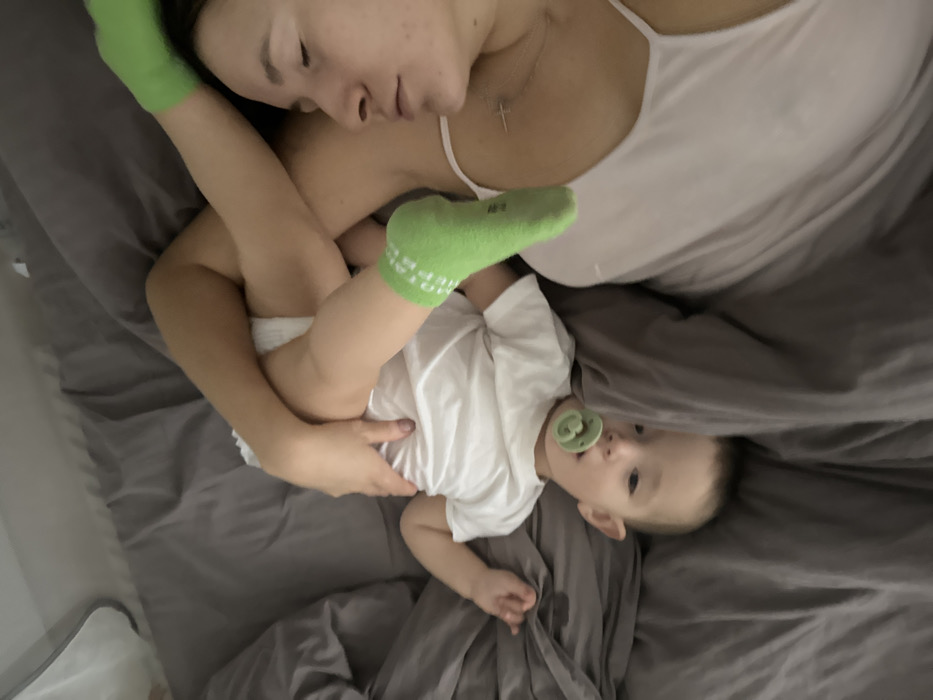 - "This image, captured in Korolyov, Russia, depicts an adult female and an infant lying on a bed covered with plain dark grey bedding" by FM-j2hvk2, licensed under CC BY 4.0