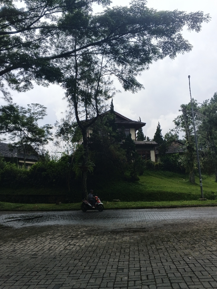 A tranquil scene unfolds with a brick-paved road leading towards verdant, elevated terrain. A rider on a scooter travels along the road. Houses nestle amongst trees and foliage, with traditional architectural designs evident in the building on the hill. Overhanging tree branches frame the top of the image, and the sky is overcast. A solitary lamppost stands to the right of the scene.