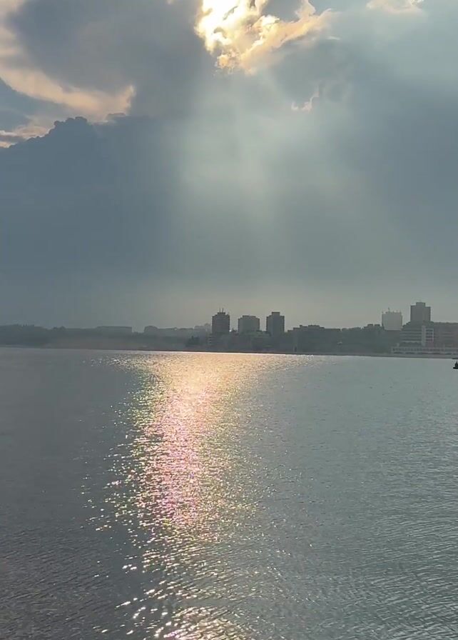 The video presents a scenic shot of a body of water, possibly a bay or river, with a cityscape visible on the distant horizon. The sky is partially covered by clouds, with the sun attempting to break through, casting rays of light onto the water's surface and creating a shimmering effect. A portion of a boat or ship is visible in the bottom left corner of the frame, docked at a concrete pier or quay. The water is calm, with gentle ripples reflecting the sunlight. The overall atmosphere is serene and somewhat dramatic due to the contrasting light and shadows.