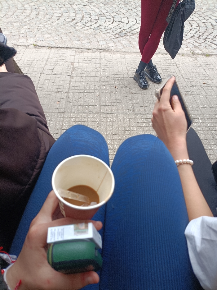 The image depicts an outdoor urban scene in Plovdiv, Bulgaria, captured from a high-angle, first-person perspective. In the immediate foreground, the legs of an individual, clad in blue ribbed leggings, are visible. This individual's left hand holds a white paper cup containing a light brown liquid with a clear plastic stirrer. Below the cup, the left hand simultaneously holds a green cylindrical object, potentially a lighter or ashtray, partially covered by a white cigarette packet with green branding. The individual's right arm, adorned with a pearl bracelet, is also visible, with the right hand holding a black smartphone housed in a clear protective case. A section of dark brown outerwear is present on the far left. In the midground, another individual stands with legs crossed, wearing dark red leggings, black socks, and black shiny patent leather sneakers. This person carries a black quilted bag, featuring a strap with the word "MOSCHINO" partially visible, hanging from their left shoulder. The ground surface comprises gray square-patterned concrete tiles in the foreground, transitioning to a gray cobblestone pattern with an arched arrangement further back.