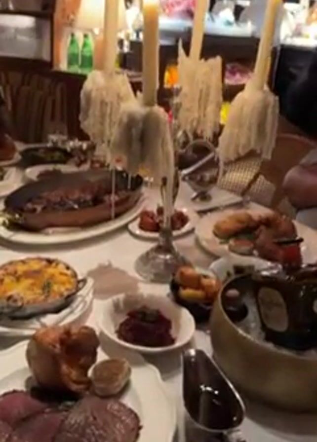 table laden with food in a restaurant setting. Several plates contain roast beef, Yorkshire pudding, beetroot, potatoes, and other dishes. A large platter holds what appears to be grilled meat. Candles stand tall in the center of the table. People are seated around the table, but only their hands and arms are visible. The background is festive, featuring Christmas decorations and chefs in white hats. The atmosphere is upscale and celebratory, suggesting a special occasion or holiday dinner.
