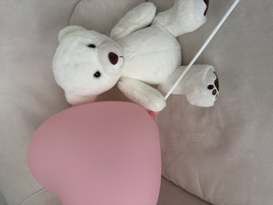 A white teddy bear lies on a beige fabric surface. The bear has black eyes and a brown nose. A pink, heart-shaped balloon is positioned beneath the bear's head. A white plastic stick runs across the bear's body from the balloon. The bear's right paw has a brown paw print on it. The fabric has subtle variations in texture and color.