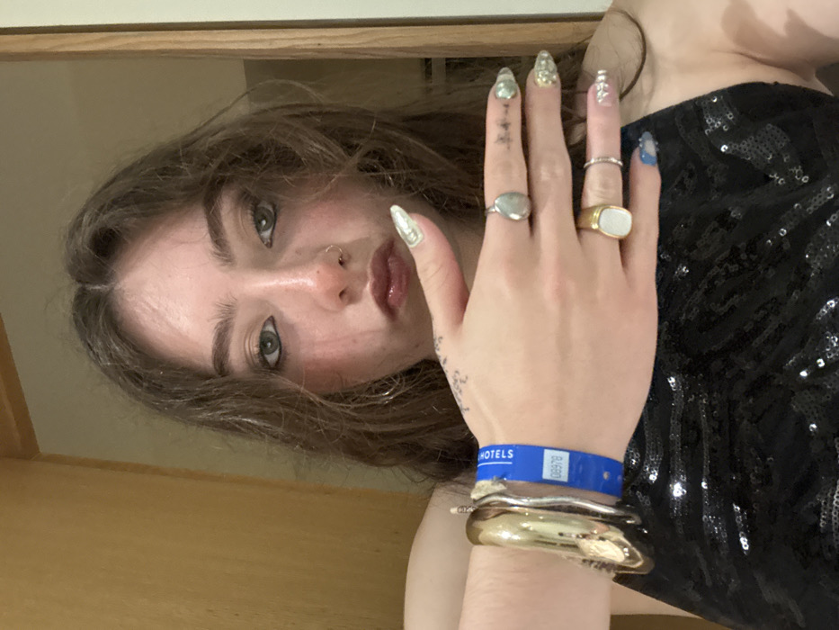 A young woman poses in a selfie, glancing at the camera with light green eyes and glossy lips. Her manicured nails are long and decorated with intricate designs. She wears several rings and bracelets, including a blue wristband from "Hotels". Her black sequined dress reflects light. Her hair is wavy and a light brown color. The background includes a light-colored wall.