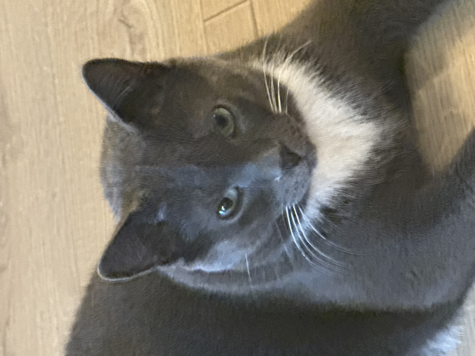 A domestic short-haired cat is depicted in a close-up, eye-level photograph. The animal possesses charcoal grey fur, complemented by a distinct white bib pattern on its chest and throat. Its eyes are green, and prominent white whiskers extend from its muzzle. The cat is lying down on a light-colored wooden floor, facing directly towards the camera with an attentive gaze. The immediate environment is an indoor setting with natural wood grain flooring visible. No people are present. The precise location within Asnières-sur-Seine, France, is not discernible from the visual information provided.