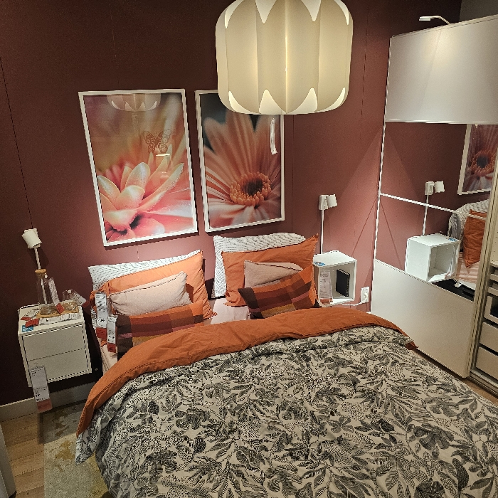 - "A bedroom scene features a bed with an orange duvet and black and white leaf-patterned bedding" by FM-63mZD2, licensed under CC BY 4.0