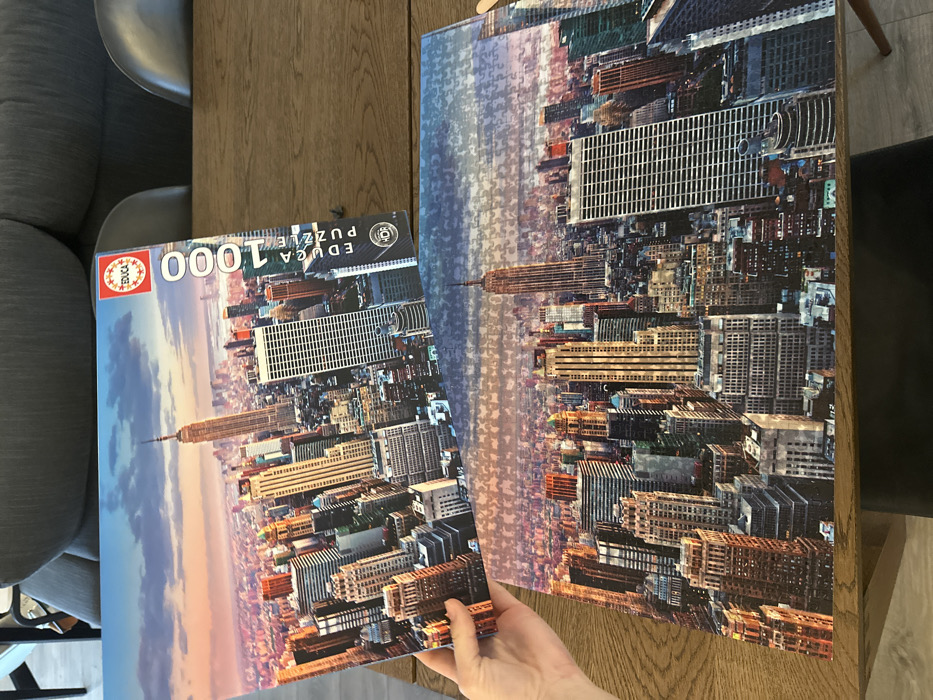 - "An indoor scene displays a human hand holding an Educa 1000-piece jigsaw puzzle box over a largely completed identical puzzle" by FM-YlWtv1, licensed under CC BY 4.0