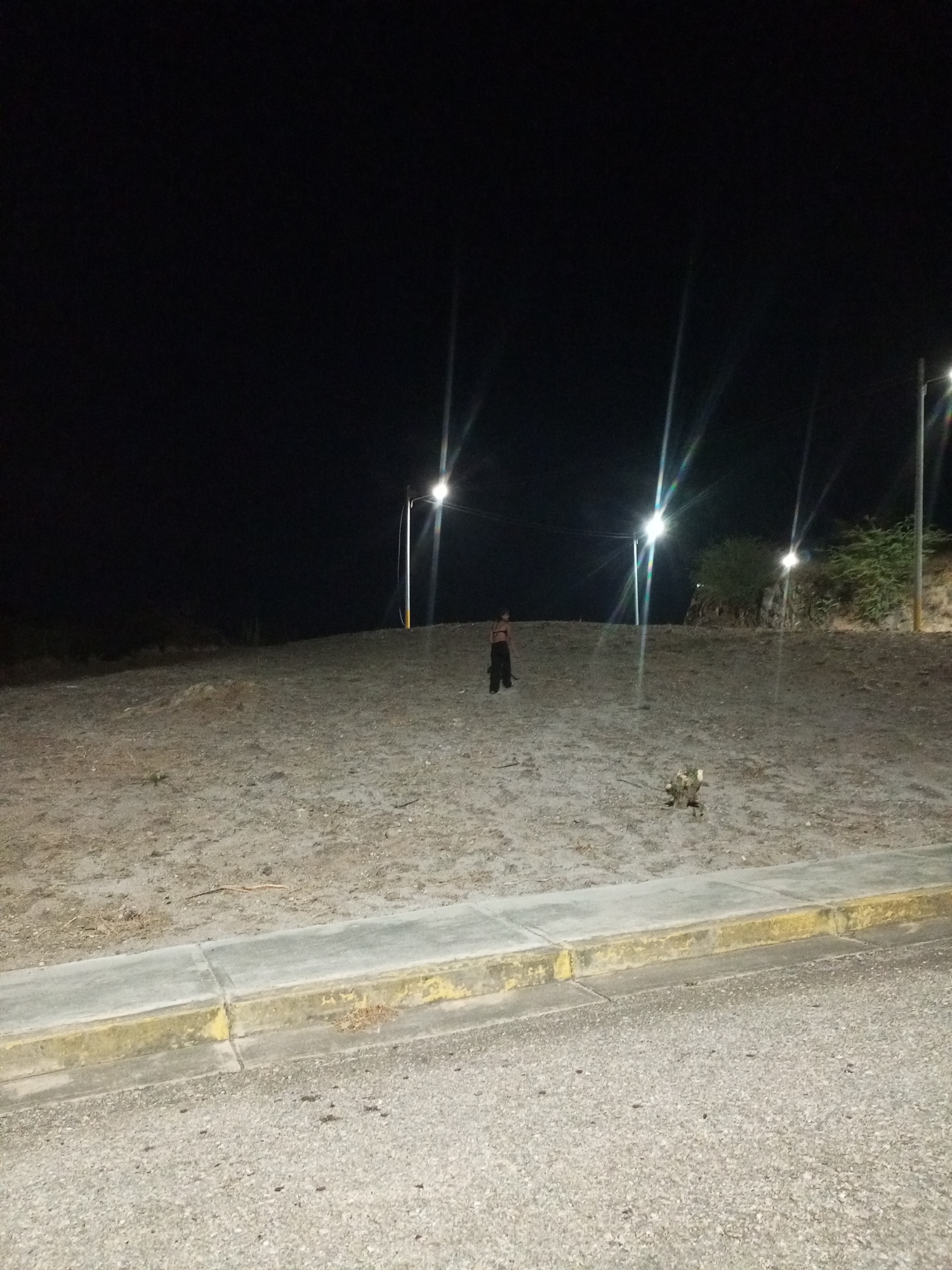 At night, on a street in what appears to be Juan Griego, Venezuela, a person stands on a sandy hill under the light of street lamps. A section of concrete curb separates the hill from the asphalt street. A tree stump is visible on the hill near the curb. The sky is dark. Vegetation is present on the far right of the hill.